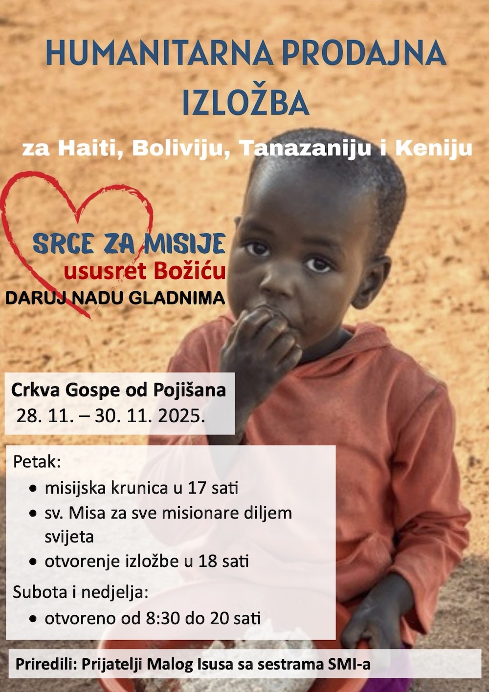 Organizatori izložbe su Prijatelji Malog Isusa u suradnji sa sestrama SMI-a, a ova je akcija poziv na darivanje nade i pomoći onima koji su suočeni s glađu u ovim zemljama.