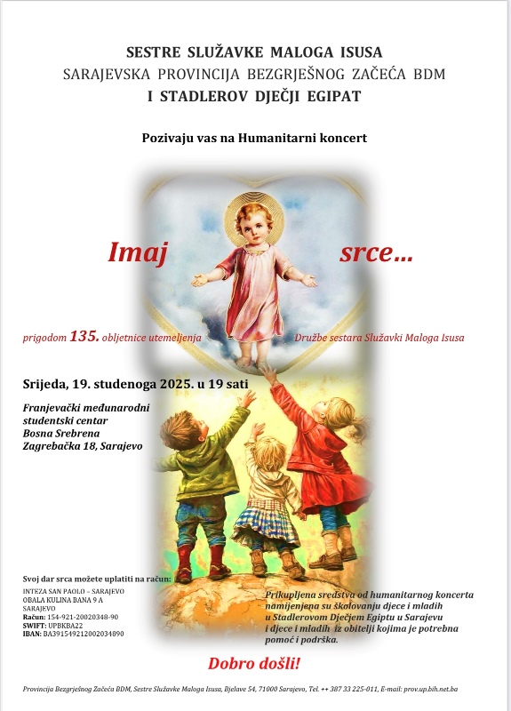 Sestre Služavke Maloga Isusa Sarajevske provincije i Stadlerov Dječji Egipat u Sarajevu organiziraju tradicionalni humanitarni koncert pod geslom sl. Božjega Josipa Stadlera „Imaj srce…“.