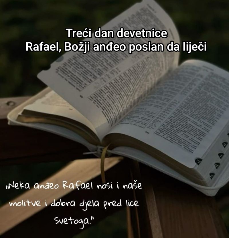 Bog šalje svog anđela Rafaela da otkrije lijek za bolesne Saru i Tobita, po Tobiji. Po vjeri i povjerenju u anđela pratioca, Tobija dobiva lijek, donosi ga bolesnima i oni ozdravljaju. Ni Sara ni Tobit nisu znali da su njihove bolesti samo zato da se očituje Božja moć i briga za njih. Nakon ozdravljenja spoznaju da je Bog na djelu kod jednog i kod drugog. Anđeo ih upućuje da blagoslivljaju Boga za dobro koje su primili kao dar od Boga. Zato blagoslivljaju Boga, slave ga i veličaju. Njihovim riječima i mi slavimo Boga u pohvalama časoslova: „Veseli se i raduj se zbog sinova pravednih, jer će biti sakupljeni i blagoslivljat će Gospodina pravednih. Blaženi oni koji te ljube! Veselit će se zbog tvoga mira! Blaženi svi koji se rastužiše zbog tvojih nesreća, jer će se radovati kad vide svu tvoju slavu, i radovat će se u vijeke. Duša moja neka hvali Boga, kralja velikoga.“ (Časoslov III. sv., 942.) Neka je blagoslovljen Bog i po našim riječima i djelima. Neka anđeo Rafael nosi i naše molitve i dobra djela pred lice Svetoga.