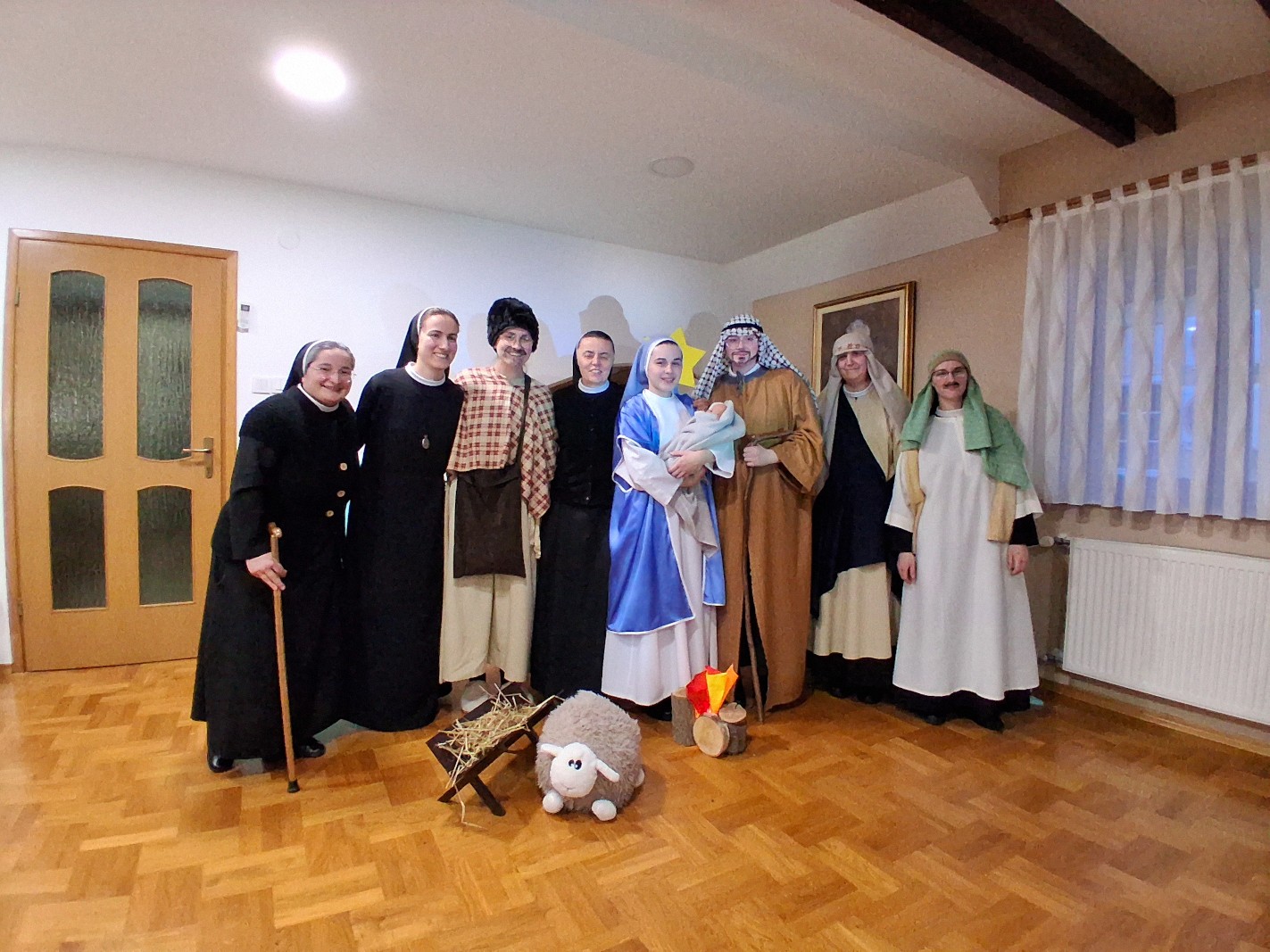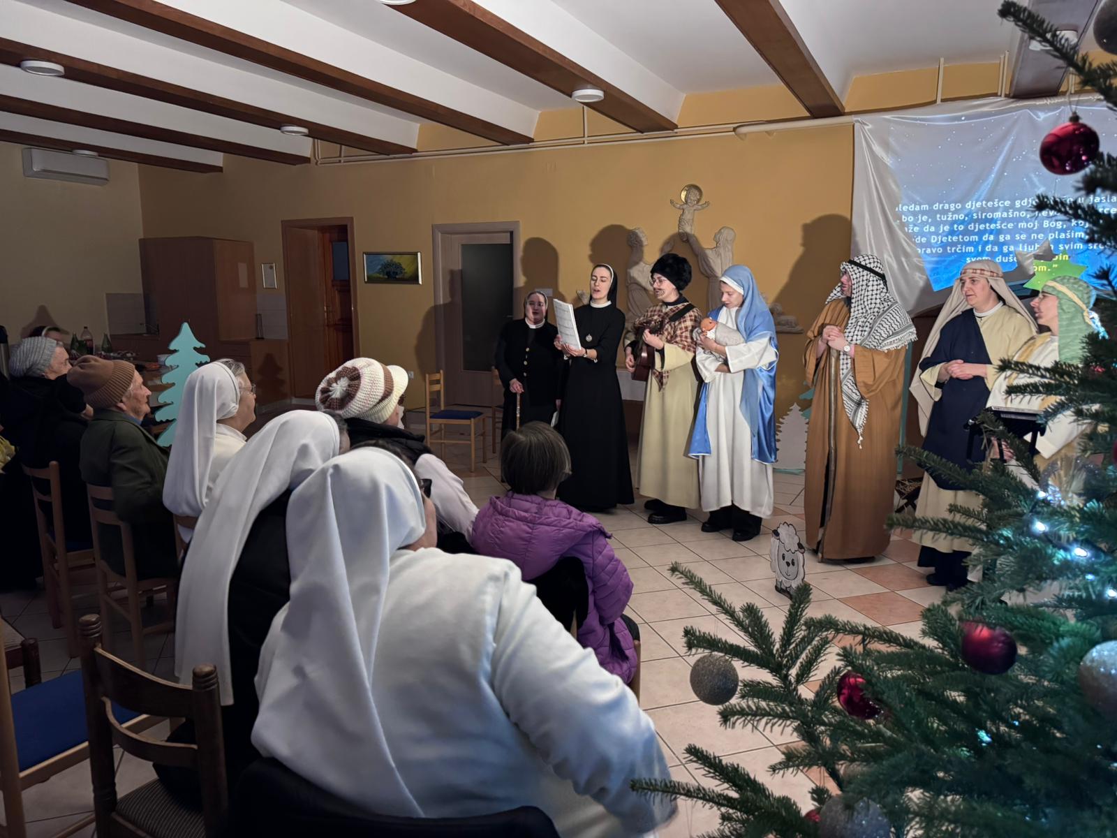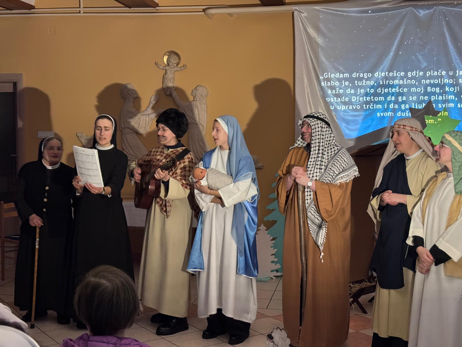Četvrtak, 8. 1. 2026. Svetkovina Kristova rođenja zadivljuje nas nježnom ljubavlju Božjom koja je svijet pohodila postavši Djetetom „da ga se ne plašimo, već da mu upravo trčimo i da ga ljubimo svim srcem, svom dušom“ (sl. B. Josip Stadler). U tom raspoloženju srca formirala se mlada glumačka družina sestara i kandidatica zagrebačke Provincije, uz podršku sestara odgajateljica s. M. Viktorije Predragović, s. M. Martine Vugrinec i s. M. Snježane Bjelobrk. Scenarij za igrokaz inspiriran je pričom švedske spisateljice Selme Lagerlof pod naslovom Sveta noć iz zbirke Legendi o Kristu, a za izvedbu sestara prilagodila ga je s. M. Tabita Kovačević. U izvedbi su kao glumci također sudjelovale: s. M. Snježana Bjelobrk, s. M. Josipa Katanec-Makaj, s. M. Darija Filipančić, novakinja s. M. Iva Ivančević, kandidatice Gabrijela Kovačević i Lara Dumanić te djevojka Marija Jurišić. Neizostavnu tehničku potporu vršila je s. M. Monika Maslać. Igrokaz Sveta noć prvi put je izveden na Božić, kao imendanski poklon s. M. Emanueli Pečnik, provincijskoj glavarici, a drugi put na svetkovinu Bogojavljenja u samostanu Betlehem na Kraljevcu. Na prvoj izvedbi u samostanu Antunovac prisustvovala je vrhovna glavarica Družbe s. M. Anđa Vranješ sa sestrama iz Vrhovne uprave Družbe.