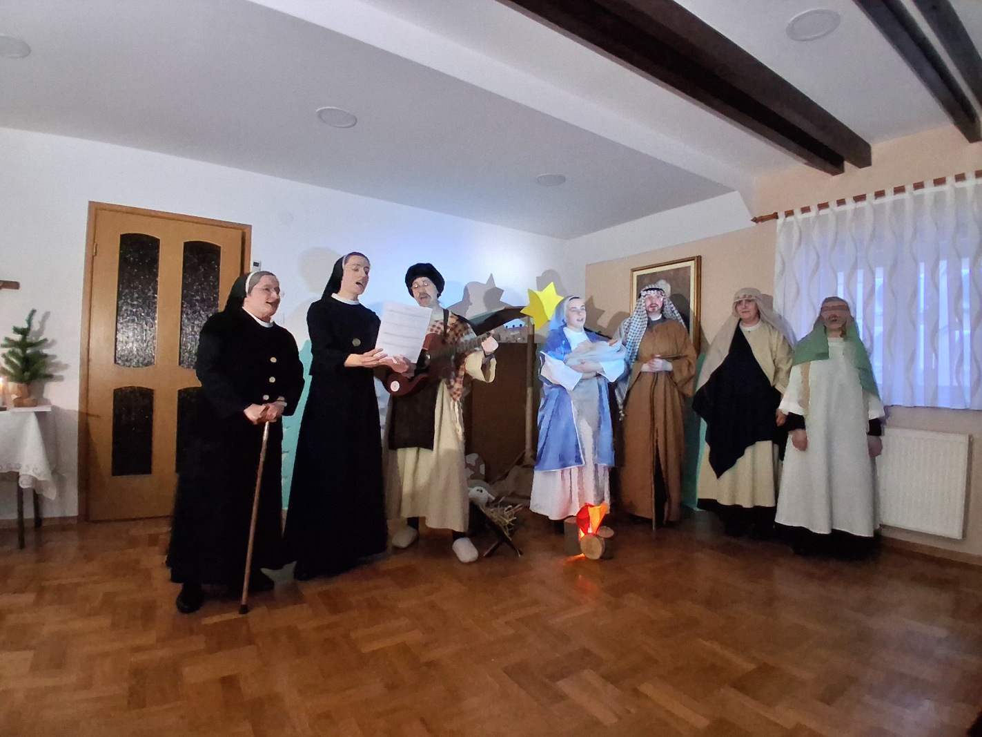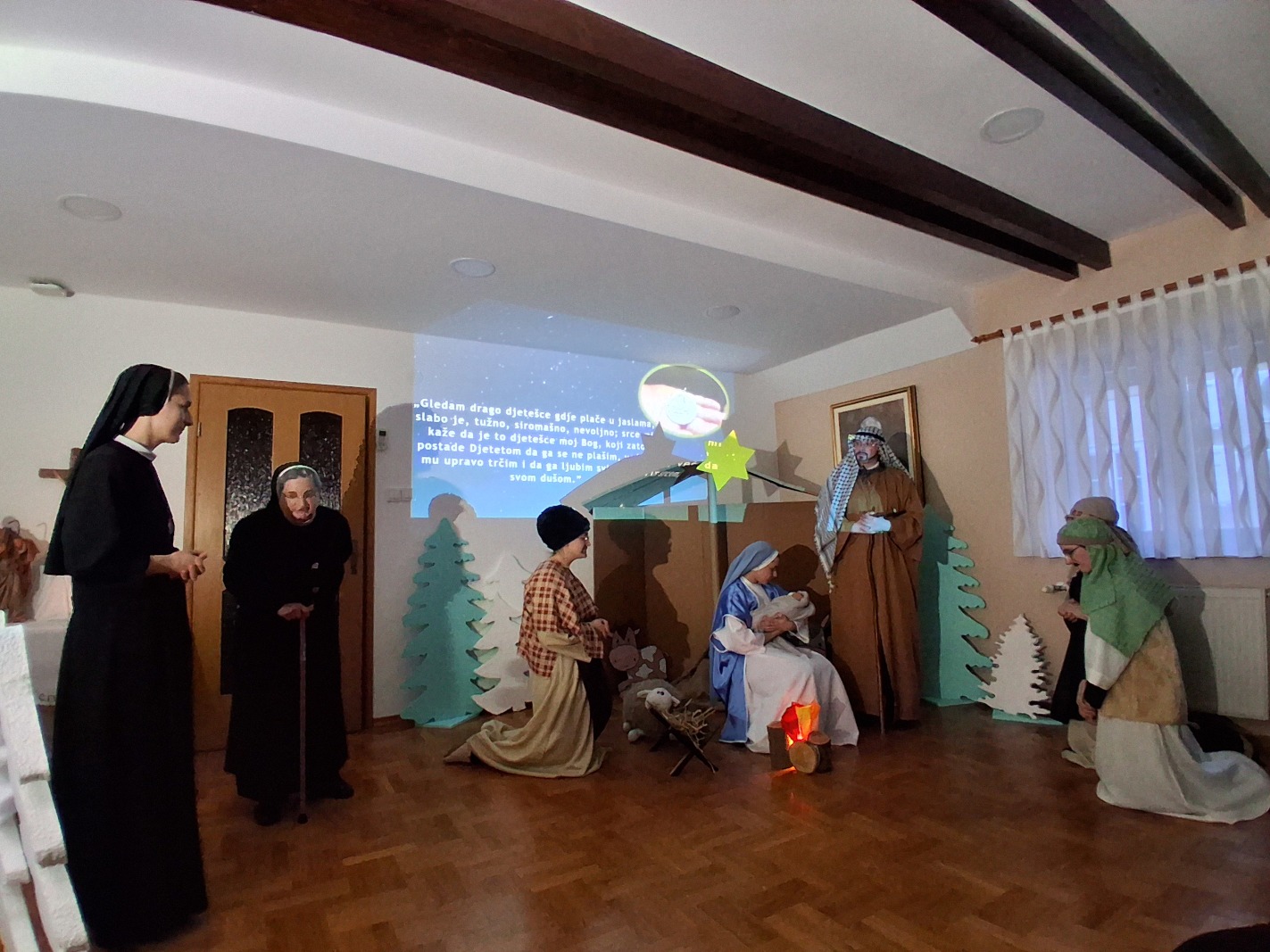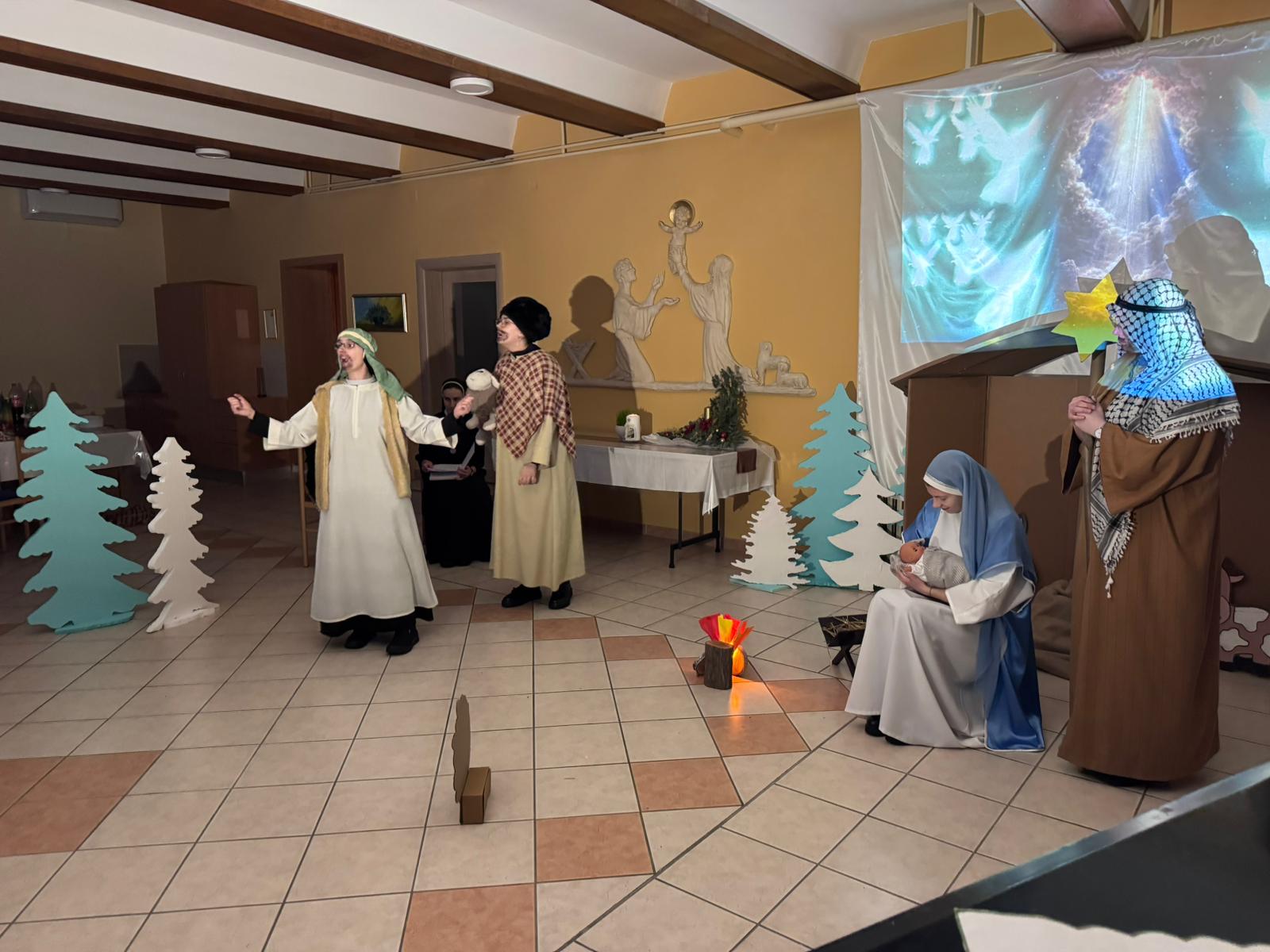 Četvrtak, 8. 1. 2026. Svetkovina Kristova rođenja zadivljuje nas nježnom ljubavlju Božjom koja je svijet pohodila postavši Djetetom „da ga se ne plašimo, već da mu upravo trčimo i da ga ljubimo svim srcem, svom dušom“ (sl. B. Josip Stadler). U tom raspoloženju srca formirala se mlada glumačka družina sestara i kandidatica zagrebačke Provincije, uz podršku sestara odgajateljica s. M. Viktorije Predragović, s. M. Martine Vugrinec i s. M. Snježane Bjelobrk. Scenarij za igrokaz inspiriran je pričom švedske spisateljice Selme Lagerlof pod naslovom Sveta noć iz zbirke Legendi o Kristu, a za izvedbu sestara prilagodila ga je s. M. Tabita Kovačević. U izvedbi su kao glumci također sudjelovale: s. M. Snježana Bjelobrk, s. M. Josipa Katanec-Makaj, s. M. Darija Filipančić, novakinja s. M. Iva Ivančević, kandidatice Gabrijela Kovačević i Lara Dumanić te djevojka Marija Jurišić. Neizostavnu tehničku potporu vršila je s. M. Monika Maslać. Igrokaz Sveta noć prvi put je izveden na Božić, kao imendanski poklon s. M. Emanueli Pečnik, provincijskoj glavarici, a drugi put na svetkovinu Bogojavljenja u samostanu Betlehem na Kraljevcu. Na prvoj izvedbi u samostanu Antunovac prisustvovala je vrhovna glavarica Družbe s. M. Anđa Vranješ sa sestrama iz Vrhovne uprave Družbe.