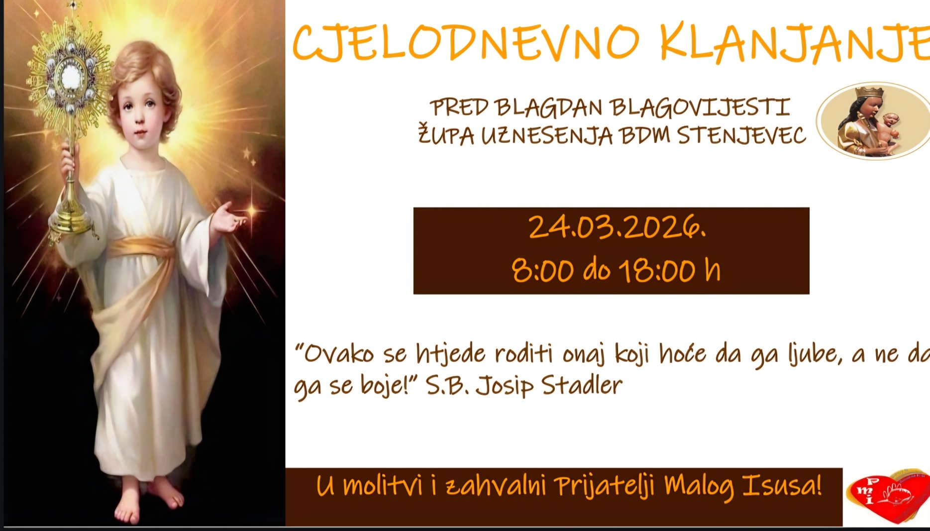 Četvrtak, 26. 3. 2026. Dana 24. ožujka 2026. godine, pred svetkovinu Blagovijesti, Prijatelji Malog Isusa iz Stenjevca, u dogovoru sa župnikom vlč. Vjekoslavom Meštrićem, imali su cjelodnevno euharistijsko klanjanje pred Presvetim Oltarskim Sakramentom.
