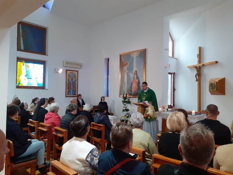 Posljednjeg dana duhovnih vježbi uslijedilo je svečano misno slavlje na kojem su novi članovi, njih jedanaest, dali svoja obećanja i primili iskaznice i statut Društva Prijatelja Malog Isusa. Zajedno sa Prijateljima Malog Isusa na misnom su slavlju sudjelovale provincijska glavarica s. M. Ana Marija Kesten i pročelnica Vijeća PMI s. M. Kristina Adžamić. Liturgijsko pjevanje i sviranje animrala je s. M. Marinela Zeko. U svojoj propovijedi vlč. Darko govorio je o prispodobi o bogatašu i Lazaru, a posebno se osvrnuo na mrvice koje su padale sa bogataševa stola, a Lazaru su značile život: „Obično se jako naglašavaju junačka, velika i veličanstvena dobra djela i njima se divimo. Ali pogledajmo, mi svakodnevno „mrvicama“ možemo učiniti stvari koje našim bližnjima puno znače, puno više nego što mi i možemo pomisliti – imati vremena za starije u obitelji, saslušati člana obitelji u njegovim tjeskobama, pomoći supruzi u kućanskim poslovima, ustupiti mjesto u javnom prijevozu i druga slična djela koja su za nas sitnica, a drugome znače“. Potom je pozvao prisutne da ne propuste prilike za činjenje dobra, nego da s ljubavlju i jednostavnošću dohvate nebo.