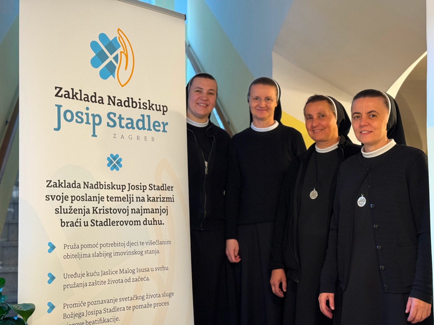 Subota, 4. 10. 2025.U župnoj crkvi sv. Ivana Krstitelja na Novoj Vesi u Zagrebu, 3. listopada 2025., pod geslom „Imaj prema Bogu srce djetinje, prema bližnjemu srce materinje, a prema sebi srce sudačko“ svečano je otvorena Zaklada „Nadbiskup Josip Stadler“. Tom svečanom događaju za Zagrebačku provinciju prisustvovala je vrhovna glavarica Družbe sestara Služavki Malog Isusa s. M. Anđa Vranješ, provincijska glavarica zagrebačke provincije Presvetog Srca Isusova i Marijina s. M. Emanuela Pečnik, vicekancelar Nadbiskupskog duhovnog stola Zagrebačke nadbiskupije vlč. Dario Kral, predsjednica Hrvatske redovničke konferencije s. Lidija Bernardica Matijević, dobročiniteljica i prijateljica Družbe dr. Agneza Szabo, župnik slavonsko - brodske župe i upravitelj svetišta Gospe od Brze pomoći preč. Anđelko Cindori, župnik župe sv. Ivana Krstitelja vlč. dr. Andrija Miličević, te ostali svećenici, sestre i Prijatelji Maloga Isusa. Posebnom svečanom ugođaju doprinio je zbor sestara Služavki Maloga Isusa pod ravnanjem s. M. Tihane Strancarić.