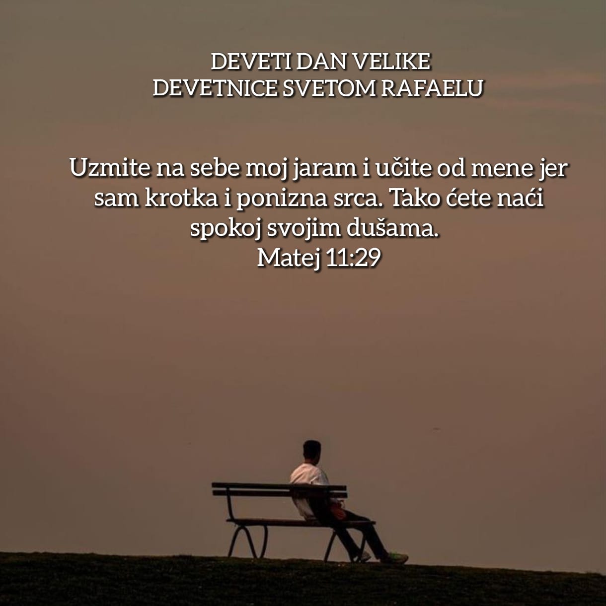 Utorak, 23. 9. 2025.IX. Savršeni arkanđele sveti Rafaele, koji si neprestano pred licem Svevišnjega, kako ti sam reče Tobiji: „Ja sam Rafael, jedan od sedmorice svetih anđela koji na nebesima donose molitve svetih i stupaju pred Slavom Svetoga!” (Tob 12,15), isprosi mi milost da nikada u životu ne izgubim iz vida Božju prisutnost kako bi sve moje misli, riječi i djela bili na slavu Bogu i za moje posvećenje.
