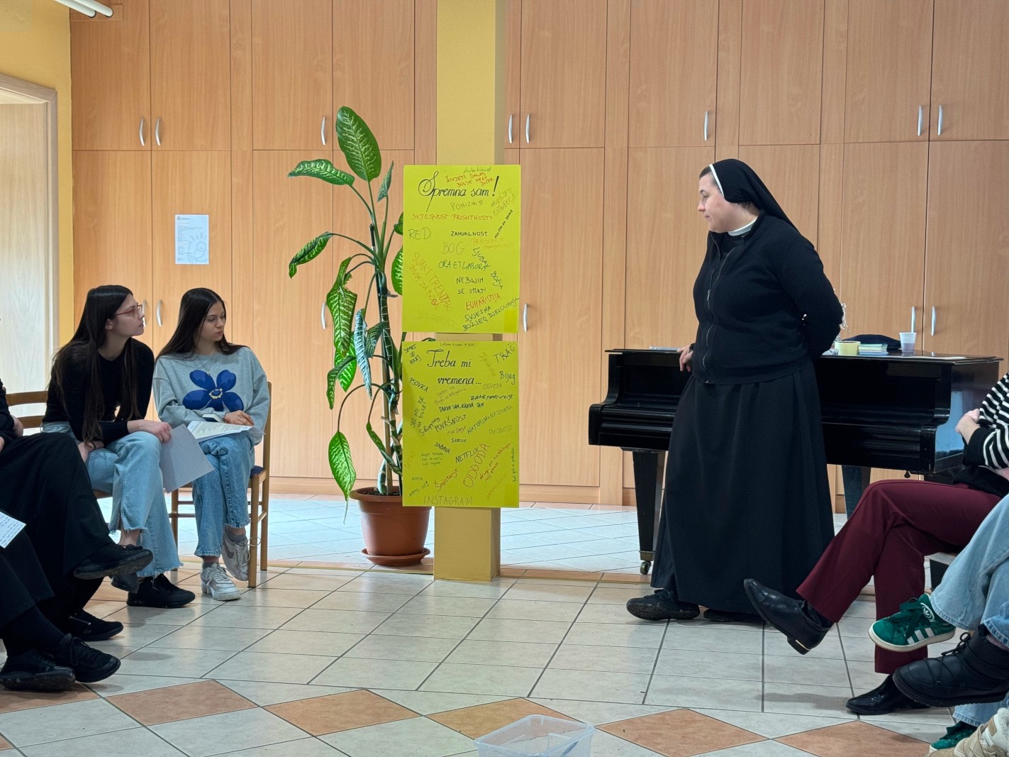 Tema susreta bila je Buđenje, odnoseći se na buđenje duše, srca i odnosa s Bogom. U našem užurbanom svijetu koji nas neprestano vuče na sve strane, dan često započinjemo pospano, namršteno i u žurbi. Upravo zato je prva aktivnost bila i više nego potrebna: pomoću emotikona prikazale smo kako izgleda naše jutro. Bilo je tu svega, od očajničkih pokušaja buđenja do smiješnih priznanja da bismo najradije ostale u krevetu do podne. Ipak, u svemu tome prepoznale smo i onaj dragocjeni trenutak u kojem se pomolimo i zahvalimo Bogu što nas je probudio i darovao nam još jedan dan. Nakon jutarnje aktivnosti uslijedio je duhovni nagovor vlč. Jakova Rađe. Nakon ispovijedi i euharistijskog slavlja, u grupnom radu razmatrale smo zadano evanđelje te pokušavale prepoznati karakteristike Kraljevstva nebeskog. Te iste karakteristike nalazile smo u Isusovom životu, ali i u životima ljudi koji nas svakodnevno okružuju. Kreativan zadatak je bila opuštajuća izrada mozaika. Euharistijsko klanjanje bilo je ono što je mene osobno najviše dotaknulo. Trenutak pun milosti u kojemu sam ponajviše osjetila Isusovu prisutnost.